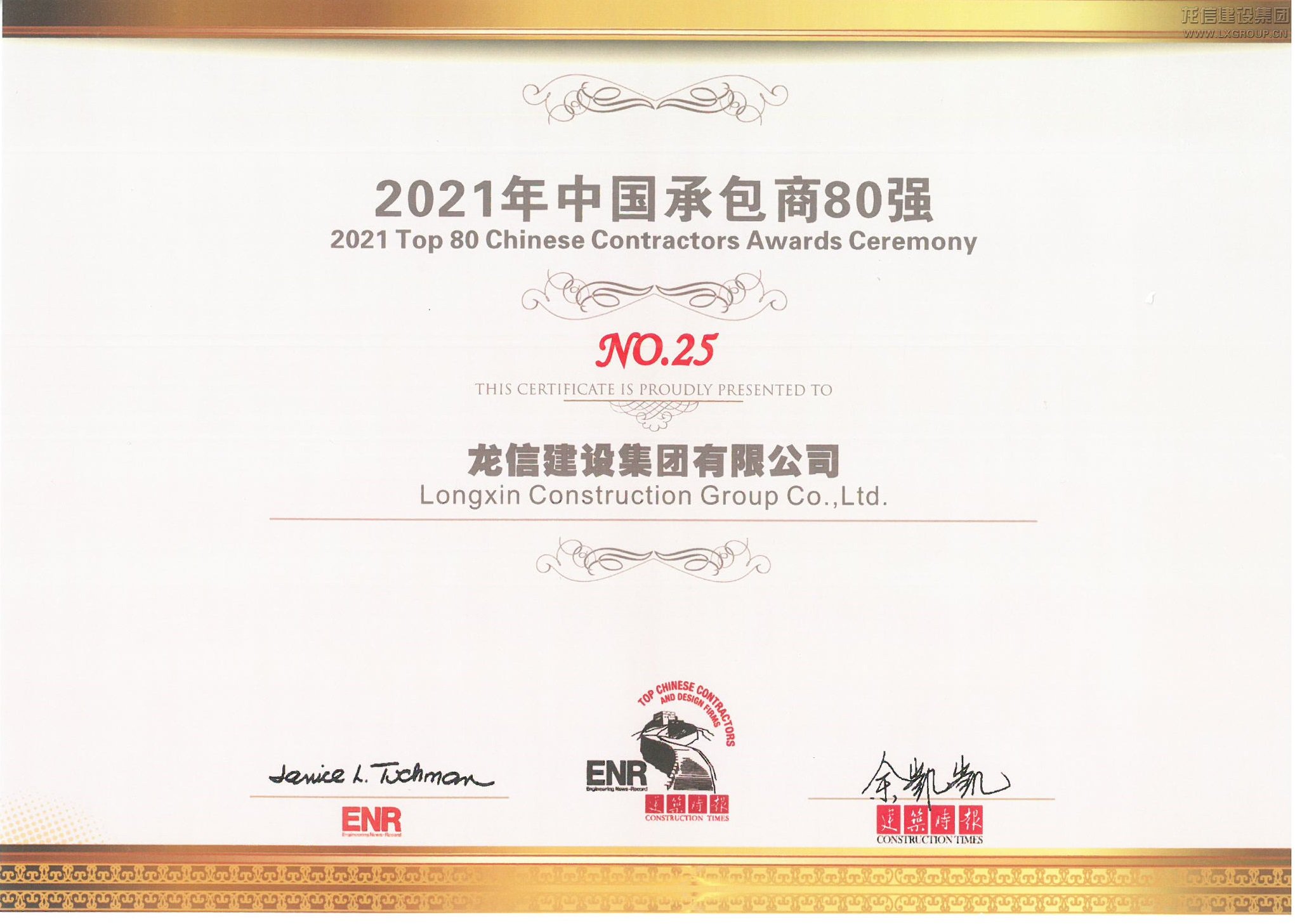 2021年中國承包商80強(qiáng)NO.25(證書)