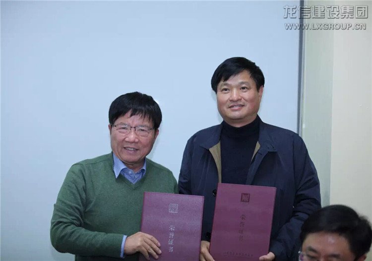 會后,蘇商會副會長恒通建設集團有限公司陳有川董事長(左)為陳祖新董事長頒發蘇商會和蘇商學院特聘導師證書,龍信建設集團成為第29家蘇商好榜樣企業。