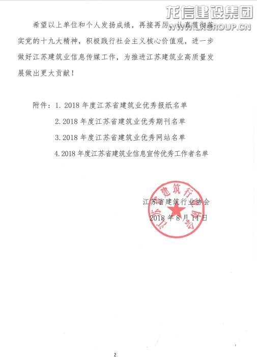 近日,江蘇省建筑行業協會公布了2018年度江蘇省建筑業信息傳媒工作競賽評審結果。《龍信》雜志榮獲2018年度江蘇省建筑業優秀期刊,龍信網站(www.lxgroup.com)榮獲2018年度江蘇省建筑業優秀網站。