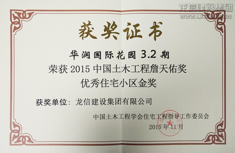 “中國土木工程詹天佑獎”是全國建設領域土木工程方面開展的最具權威的表彰獎勵項目,也是國家科技獎勵辦公室首批核準的社會科技獎勵項目。創新性、先進性與權威性是“詹天佑獎”評選最能代表的三個方面。華潤國際花園項目憑借質量、環境、規劃、科技等方面的杰出表現,重新定義了于傳統模式完全不同的高品質城市生活。本次“詹天佑獎優秀住宅小區金獎”的榮獲是對龍信建設品牌的認可,公司始終秉承誠信經營理念,贏得無數榮譽的同時,屢屢在行業中收獲好評。公司堅信打造企業品牌的不是媒體,而是企業本身,扎扎實實做好品質,品牌才能得以樹立和發展。
